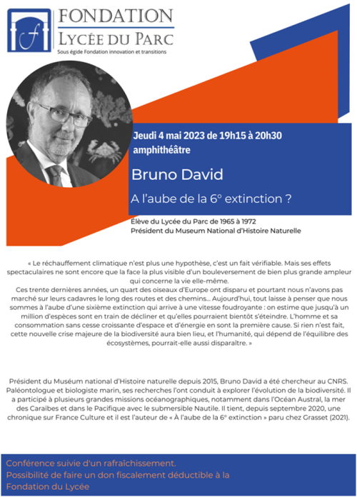 Nous avons le plaisir de vous convier à la 3e et dernière conférence de ce cycle 2022-2023, de Bruno David, élève du Lycée du Parc de 1965 à 1972, Président du Muséum National d’Histoire Naturelle Paris, le jeudi 4 mai de 19 h 15 à 20 h 30 à l’amphithéâtre du Lycée du Parc :